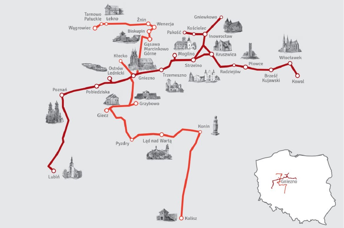 Toeristen kunnen deelnemen aan de hele route, die gaat door Ostrów Lednicki, Gniezno, Trzemeszno, en ook Mogilno, Strzelno en Kruszawica. Op hun terugweg naar Poznan, wordt de toeristen aangeraden te stoppen in Biskupin om dan via Gniezno, aan de komen in Giecz. Men kan uiteraard ook een gedeelte van deze route aandoen. De Piasten waren vroeger een adelgeslacht en hun gebouwen waren opgetrokken in steen. Ze symboliseerden de nieuwe wereld en vormden mee de ziel van een nieuw gevormde staat en religie. In het toenmalige landschap van houten dorpen sprongen de hierboven vermeldde plaatsen in het oog.