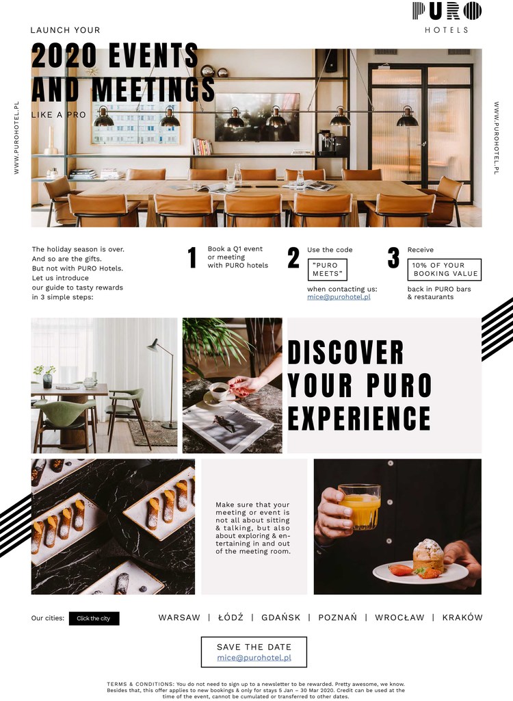 De PURO hotels liggen in het centrum van de stad en zijn geïnspireerd door de lokale artistieke en culinaire omgeving. Ze creëren ervaringen die gebaseerd zijn op vrijheid, diversiteit, aandacht voor detail en een weerspiegeling van de authentieke geest van de plaats. PURO toont een originele aanpak om de cultuur van de gekozen plaats te leren kennen, hetgeen vaak internationale erkenning heeft gekregen, meest recentelijk in Londen tijdens de Ahead Awards 2019. PURO Lódź ontving toen de prijs voor de beste evenementenlocatie voor de Cinema Paradiso zaal, dat herinnert aan het belang van deze stad voor de ontwikkeling van de Poolse cinema. Nog niet zo lang geleden, in 2018, werd PURO Gdańsk bekroond voor het beste barconcept - INK Above. De Poolse PURO hotels laten een culturele stempel achter op de internationale arena en zijn op zich al voldoende reden om Polen als volgende bestemming te kiezen.