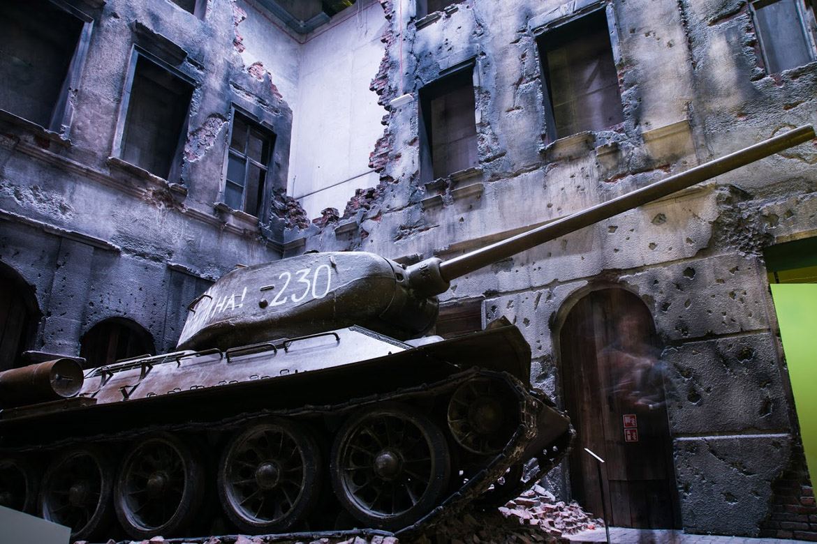 We zien ook o.a. een gereconstrueerde vooroorlogse straat en ook iets voor liefhebbers van militaire voorwerpen: militair materieel waaronder een Sherman tank en een T-34 tank. Deze tanks waren dermate groot dat ze werden geplaatst voordat de muren en dak van het museum gebouwd zijn.