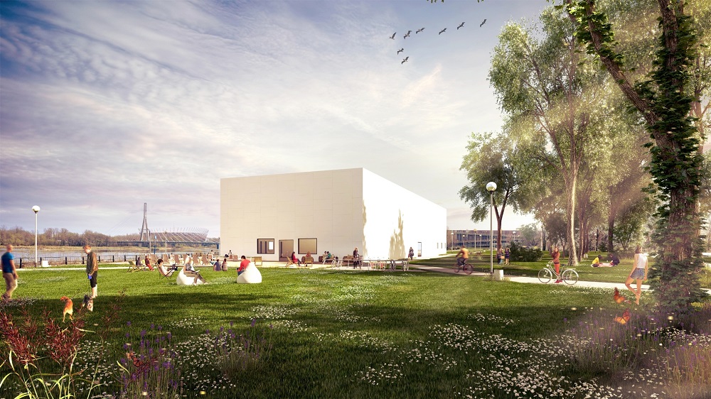 Pawilon is een spierwitte kubus, die perfect past bij de nabijgelegen moderne architectuur van het wetenschapsmuseum Kopernik of het gebouw van de Universiteitsbibliotheek. Het is een ontwerp van de Oostenrijkse architect Adolf Krischanitz. Het werd gebouwd als een verplaatsbare constructie en diende eerder al als onderkomen voor de Berlijnse galerij Kunsthalle. Het is trouwens niet de bedoeling dat het gebouw zo wit blijft. De façade langs de kant van de rivier krijgt binnenkort, op vraag van de architect, een kleurrijke grafiek van de hand van Sławomir Pawszak. Binnenin is er een grote tentoonstellingshal van 600 vierkante meter oppervlakte en 12 meter hoog. Er is ook een café en een boekenwinkel.