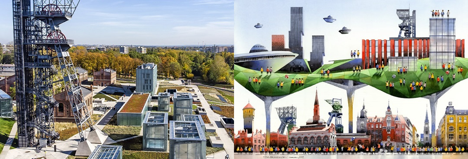 Katowice is nog zo'n stad waar de sporen van het verleden op een heel sierlijke manier harmoniëren met het heden. Het schilderij van Tytus Brzozowski is een van de meest magische uit de serie en laat zien hoe historische architectuur samengaat met de moderne aspiraties van de stad. Hier heeft de kunstenaar het oude Katowice afgebeeld met zijn mijnverleden, maar ook zijn statige panden, de Mariackastraat en neogotische kerken. Daarboven is er echter een groene weide met moderne architectuur. U kunt er niet alleen het beroemde Spodek vinden, maar ook andere gebouwen, waaronder het Silezisch Museum.