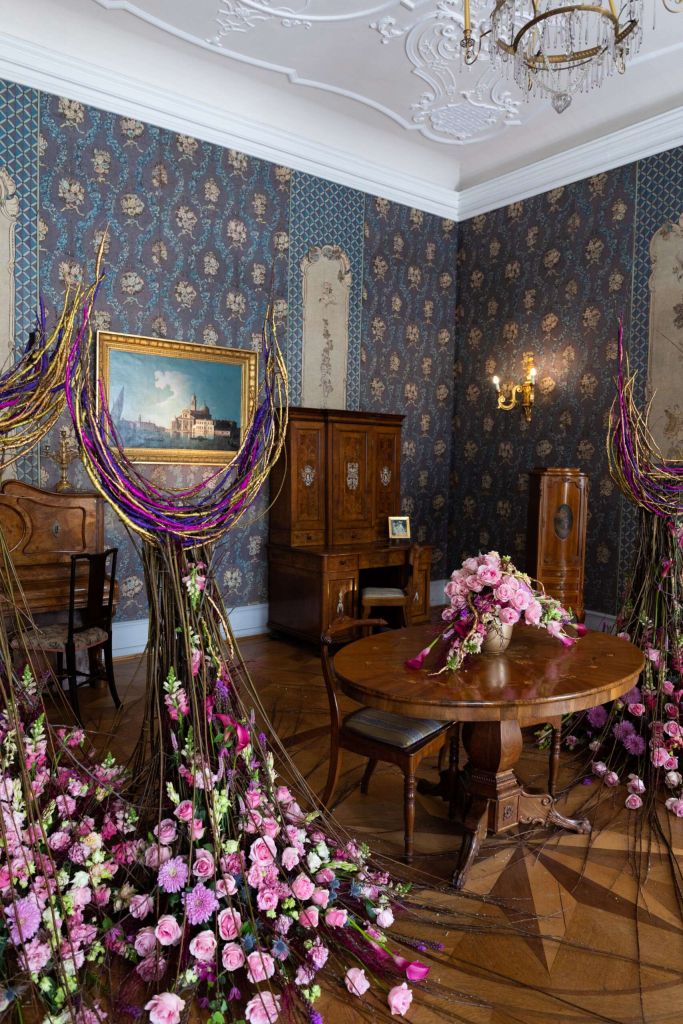 Gjennom hele festivalen fylles slottets historiske interiører og terrasser med ekstraordinære blomsteroppsatser laget av store blomsterhandlere fra både Polen og utlandet. Hvert rom uttrykker noe unikt, fra romantiske blomsterkomposisjoner med roser og peoner til moderne, overraskende kunstneriske installasjoner. Det er ikke bare en fest for øynene, men også et inspirerende møte mellom kunst og natur.