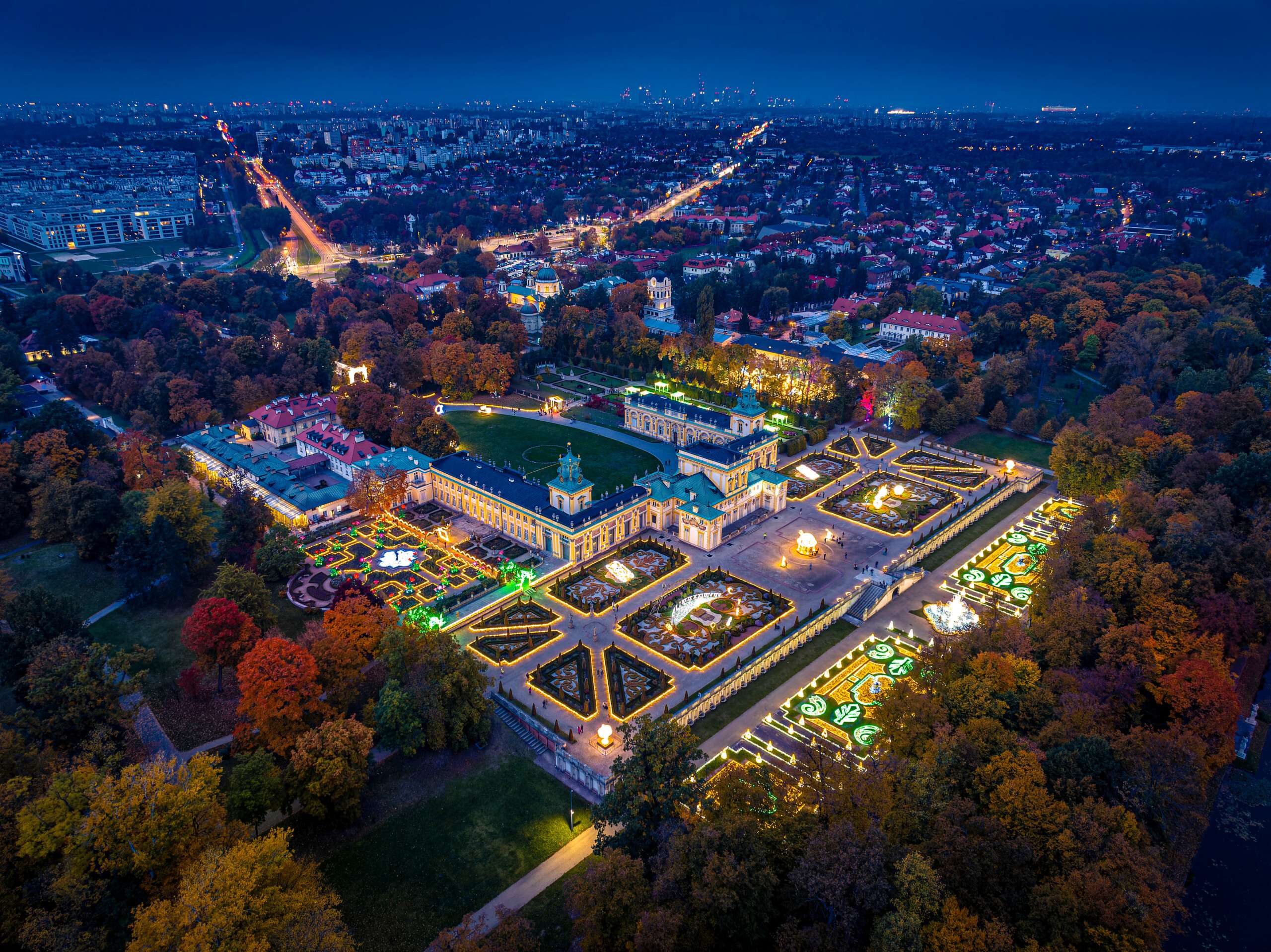 På vintern får Wilanów en helt annan karaktär. Då förvandlas området till ett stämningsfullt ljuspalats med installationer och ljusshower som lockar många besökare. Det gör att platsen känns magisk även när trädgårdarna vilar.