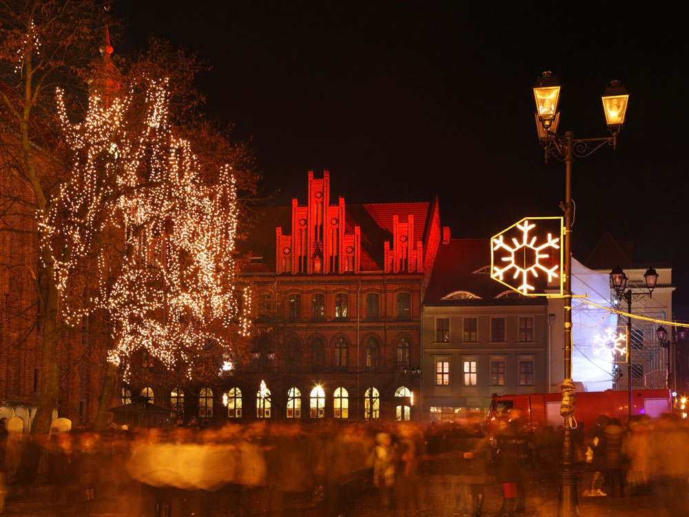 Toruń ist zu jeder Jahreszeit bezaubernd, aber die beleuchtete Altstadt und das beleuchtete Panorama machen besonders während der Winter- und Ferienzeit einen festlichen Eindruck. Winterliche Gemütlichkeit finden Sie in zauberhaften Cafés, im Rahmen städtischer Dekorationen und auf dem Weihnachtsmarkt in Toruń.